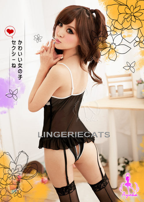 Attractive Chiffon Corset Set, Asian Lingerie, Chemise, Japanese Lingerie, Sexy Black Corset, Sexy Lingeire Set, Stocking Lingerie
