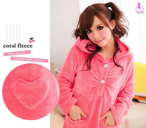 ◆Description:Soft and comfy as a cotton candy! Made from warm coral fleece. Hooded pajama dress with two front pockets in heart design. Perfect for your everynight, easy to wash and clean.