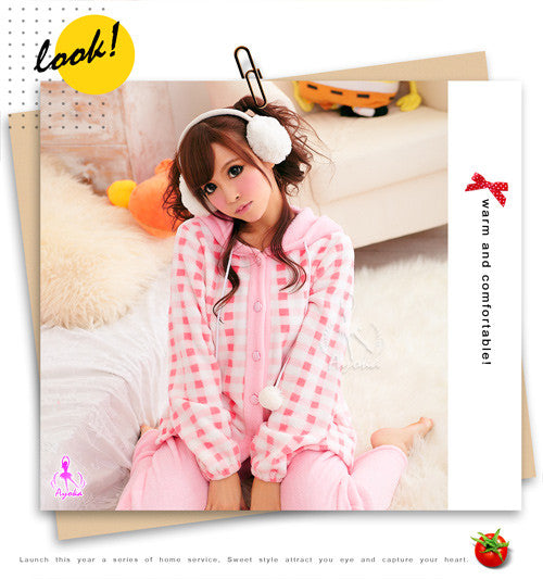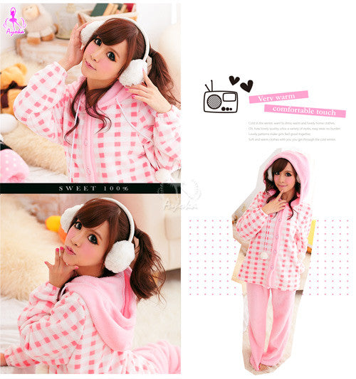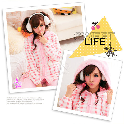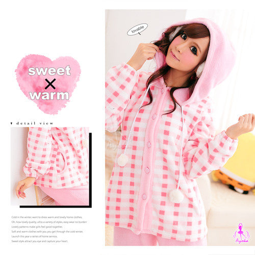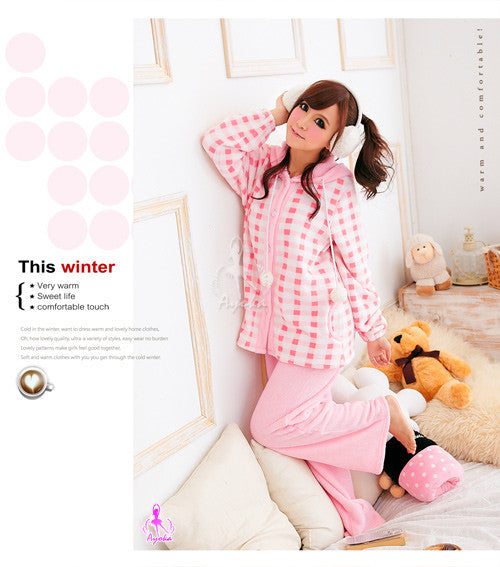 ◆Description:Soft and comfy as a cotton candy! Made from warm coral fleece. Hooded button-front top has two pockets. Drawstrings at sleeves hem. Full-length pants with elastic waist.